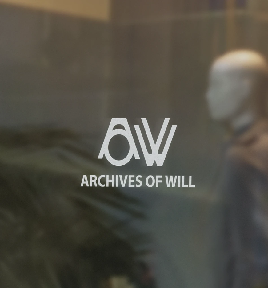 Glass door or window with the logo and text 'Archives of Will' and initials 'AOW' in white.