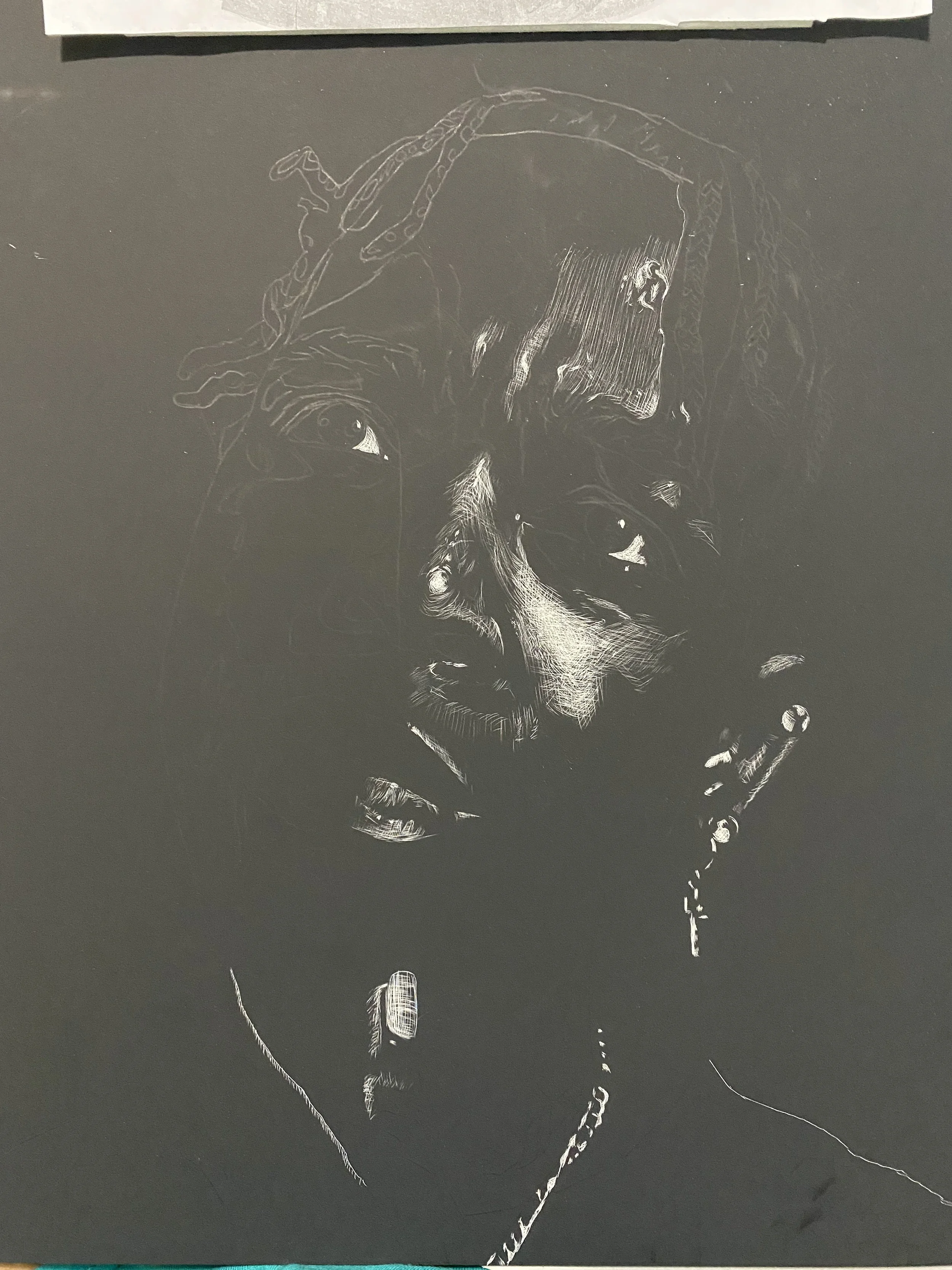 “Scratchboard Project” - Designed in Drawing 2 Class in 2021 Took 48 Hours To Design Made Using Scratchboard & an Exacto Knife Inspiration: Myself Objective: Creating an emotional self-portrait on scratchboard